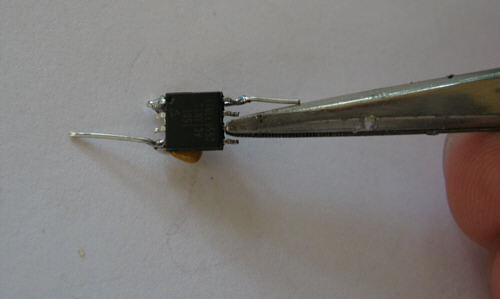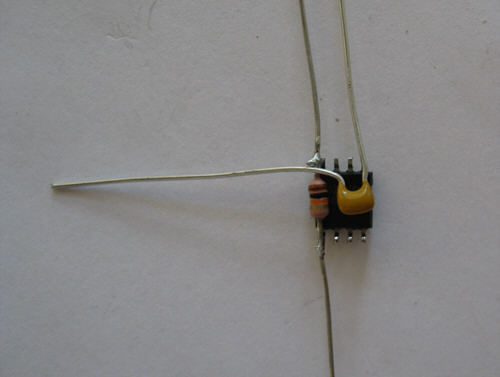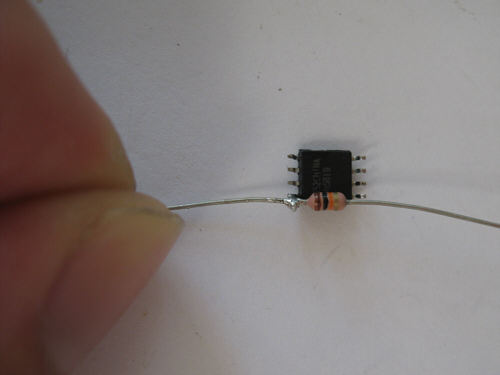 Step 2 - The chip is flipped upside down and the 10k resistor is placed across the surface. Then it is soldered to one pin. The marking for pin 1 is below the lower left corner of the chip (faces to the working surface)