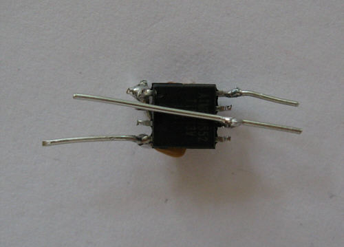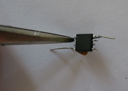 Step 12 - A piece of wire is placed on the chip surface to connect both upside bended pins. Solder wire to pins. It is best to hold wire during soldering because the speed of heat distribution will unsolder the second solder point.