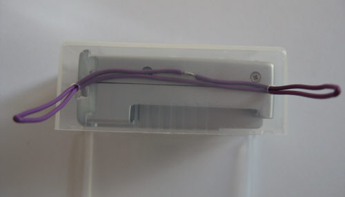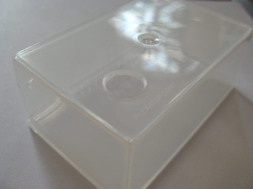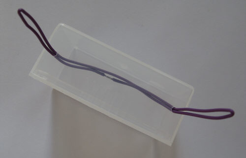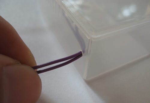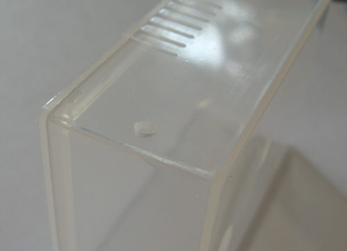 Step 2 - Drill the holes for the collar straps on the oustide of the top of the housing. A 2mm (0.08 inch) diameter should be sufficient but tight enough for the straps. Schritt 2 - Die Löcher fuer die Halsbandaufhängung an den Außenseiten der Oberseite bohren. Ein Druchmesser von 2mm sollte ausreichend aber trotzdem noch eng genug sein für die Drähte.