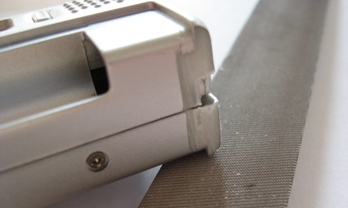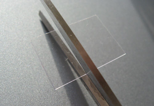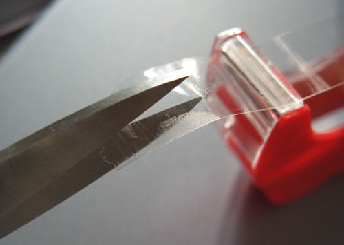 Step 4 - To fix the window to the housing, office tape like Scotch-Clear-Tape is used. The tape is usually too broad. Cut stripes in half, approx. 5-6mm (0.2 inch) broad. Schritt 4 - Um das Sichtfenster am Gehäuse zu befestigen wird klares Tese-Klebeband verwendet. Das Band ist üblicherweise zu breit, deshalb wird es in ca. 5-6mm breite Streifen geschnitten.