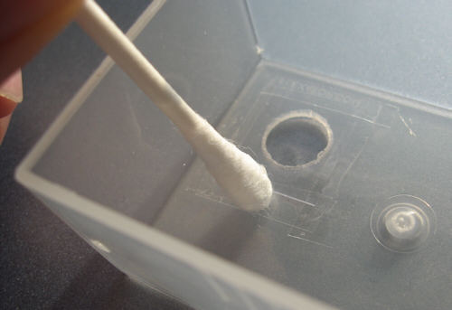 Step 5 - Place one tape stripe on a window edge so that it is half on the window and half off. Place the window in the housing over the lens hole. Use a Q-tip to fix the tape to the housing. The goal is that the window is fixes around all 4 sides. No tape should be in the area of the hole. Schritt 5 - Platziere einen Klebebandstreifen auf einer Seite des Sichtfensters, so dass etwa die Hälfte davon überhängt. Dann das Sichtfenster im Gehäuse über der Linsenöffnung platzieren und mit einem Wattestäbchen das Klebeband andrücken. Das Ziel ist das Sichtfenster umlaufend mit Klebeband fest zu machen und zwar so, dass das Klebeband nicht in den Bereich des Loches kommt.