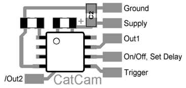 The pinouts of the controller boards are shown above. Left is the Rev. 1 board, right the new Rev. 2 board. The board offers convinient sized solder pads for easy soldering. For details on the function of the different signals see the controller datasheet.
