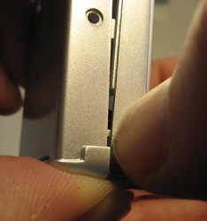 Step 4 - There is a lock latch hidden near the keychain bar. You must press down on the backside of the camera enclosure as shown above in order to release the latch. Pull with the other hand the front side of the camera enclosure. Schritt 4 - Es gibt ein versteckte Sicherungslasche die das einfache Öffnen des Gehäuses verhindert. Nahe der Aufhängung für den Schlüsselanhänger muss die Rückseitenteil des Gehäuses wie im Bild gezeigt nach unten gedrückt werden. Gleichzeitig mit der anderen Hand die Vorderseite des Kameragehäuses ziehen.