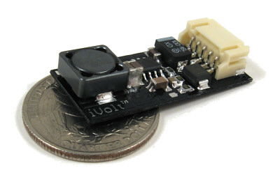 This module offers high efficiency (up to 95%) step down converter in a small size (16x36mm / 0.63x1.41 inch). It reduces the input voltage (2.5V-14V) to a lower output voltage (adjustable between 0.8V and 85% of input voltage).